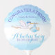 Celebrate the the imminent arrival of a new baby boy with this cute flying stork and baby congratulations a baby boy is on his way balloon. Ideal to add to floral gifts or to display at baby showering events. Other matching items available. Original art and design by Sarah Trett for www.mylittleeden.com on zazzle.