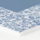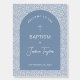 An arched blue baptism design, recommended for baby boy's christening, that combines the old and the new: a modern blue arch on a vintage blue and white floral pattern that resembles French toile de Joy or chinoiserie. The name is written in script. The text is white, inside the blue arch. In the upper part of the blue arch, above most of the text there is a white cross and above the cross there is the arched welcome message.