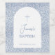 An arched blue and white baptism design, recommended for a baby boy's christening, that combines the old and the new: a modern arch on a vintage blue and white floral pattern that resembles French toile de Jouy or chinoiserie. The name is written in script. The text is blue, inside the white arch. In the upper part of the arch, above the text there is a blue cross and above the cross.