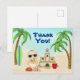 This Thank You postcard features a cute boy beach baby sipping his lemon aid. He is standing with his sea friends a crab and starfish, an impressive sandcastle and his surfboard all surrounded by tropical palm trees. Some graphics by artwork©delightful-doodles.com and CherylSeslarDesigns.com at DigiWebStudio.com. *