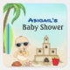 This cute beach Baby Shower sticker design for boys features a cute beach baby sipping his lemon aid. He is standing with his sea friends a crab and starfish, an impressive sandcastle and his surfboard. It can be personalized with a name and any text that you wish to add. Some graphics by artwork©delightful-doodles.com and CherylSeslarDesigns.com at DigiWebStudio.com.