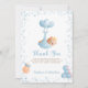 This adorable baby shower thank you card features a boy teddy bear being flown by balloons with elegant script and modern text for your details. Back features teddy bear holding a balloon. Easy to customize by clicking "Personalize".