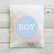 This fun gender reveal party sticker features bold "BOY" text in white on a classic blue background. Perfect for sealing favor bags, labeling treats, or decorating gifts at a gender reveal celebration or baby shower. The clean, bold design makes a classic team boy statement. All text is fully customizable.