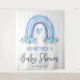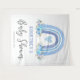 Rustic bohemian boy baby shower tapestry featuring a simple white background, a cute watercolor boho rainbow, elegant blue florals, and a modern welcome to template that is easy to customize.