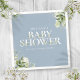 An elegant baby shower napkin featuring modern typography and pretty botanical greenery foliage on a dusty blue background. Designed by Thisisnotme©