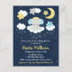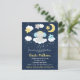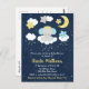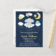 This cute and whimsical invitation features an adorable baby elephant in a gold crown sitting on a cloud with falling stars. In the background is a starry night sky and crescent moon. The text combines handwritten script and sans serif fonts for a stylish and modern look. This is perfect for a baby shower.