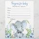 Boy elephant baby shower games with cute baby elephant with bow tie on a blue floral greenery background. These elephant baby shower game flyers are double sided with two different games.