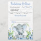 Boy elephant baby shower games with cute baby elephant with cute bow tie on a blue floral greenery background. These boy elephant baby shower game flyers are double sided with two different games.