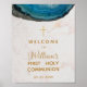 A modern baptism Welcome poster recommended for a boy's christening. In the upper part there is a blue agate geode. The background is white marble. The text is golden, written in caps, except the name, written with an elegant calligraphic script. There is a gold cross above the text (and under the geode).