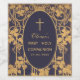 This blue, elegant wine label with a vintage air, appropriate for a boy's first holy communion, has a vintage golden frame with gold decorations representing vines,and grapes on a navy blue background. The text is in an oval in the center. Above the oval there is a gold crown. In the upper part of the oval, above the text, there is a gold cross. The name of the child is written in an elegant calligraphic script, the rest in caps. All text can be personalized and has a golden color similar to the gold decorations of the frame.