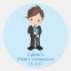 An adorable sticker featuring a a brunette boy holding a bible with a rosary hanging from his hands. Perfect to adorn favors, favor bags or use as envelope seals.