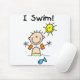 A boy stick figure swims with the fish and the sun smiles down on him on this colorful and cute stick figure boy I Swim bag that's customizable so you can add a name
