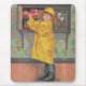 Vintage children's image of a boy in a raincoat at a cabinet.