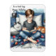 A card for a cool young boy who loves to read books and hang out with his cats. A scene with a boy sitting cross legged on his bed reading a novel with his two cats while listening to his music. Happy Birthday, cool guy!