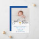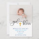This sweet birth announcement features a single photo at the top and birth information at the bottom. The middle of the design features text that says "god bless" with a simulated gold cross.