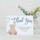 This cute teddy bear baby shower thank you flat card is so sweet. Design features a brown teddy bear holding a balloon on a blue watercolor background.