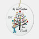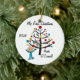 A pretty round ceramic keepsake Christmas holiday ornament features a stick figure boy in a blue sleeper in front of the decorated Christmas tree with family cat in the tree, and areas where you can add text including the current year and child's name. This is an adorable gift for any baby boy celebrating his first Christmas!