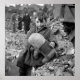 Old WW2 photoo of abandoned boy holding a stuffed animal toy amid ruins following German aerial bombing of London. Picture taken in 1945 by photographer Toni Frissell.
