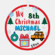 Boy 8th Christmas in green or for any age year. My Christmas in fun snowcapped red typography. Child's Name in blue. Insert YEAR, or backspace text to leave area blank. Fun orange car and snowflakes, trees, green ornament, blue gift box. Peace on Earth written on backside of two-sided items. Designs by TamiraZDesigns.