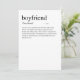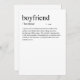 Add some humor and style to your Valentine's Day gift with this funny "Boyfriend Definition" card. Featuring witty, minimalist typography and a clean look, it delivers a fun, lighthearted message that’s sure to make your significant other smile. There’s also a blank space where you can include your personalized handwritten message for him. Want a custom, witty characteristic added to the definition? Reach out to me at: shahirah.creates92@gmail.com, and I’ll make it uniquely yours.