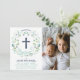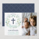 This elegant and stylish baptism, christening invitation features an illustrated floral wreath with the word "Baptism" encircling a cross. The right side of the card includes a customizable photo area. The text color, font and message can be changed to your liking. The back of the invite features a navy background (that can be swapped to any color of your choice) with a white quatrefoil pattern.