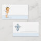 Baptism place cards with angel baby boy on a blue dot background on one side and a baby blue cross on the other with a line for your handwritten name when they arrive. Simply place the card at the table place setting.