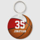 This boys' basketball keychain features a simple basketball graphic with his red and white school colors on two of the basketball's panels and easily customizable player name and large jersey number in a sporty, varsity letter style font - by katz_d_zynes
