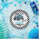 Monster truck themed birthday paper plate for boy featuring a blue truck, racing flags and various text in black and blue fluorescent text. Can be used for any age.
