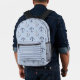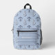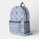 Navy Blue and White nautical anchors on a light blue background. Front pocket has navy blue stripes and a perfect place to personalize.