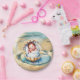 Boy's Baby Shower paper plates. Sweet soft pastel brown and blue coastal seaside baby shower theme. A little baby boy sleeping inside a white and gold seashell.