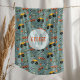 This cool personalized kids fleece blanket design features a car pattern, with an orange and blue racing car with black wheels, a motorbike, and hot flames. There is also space for you to add your boys name and monogram in modern typography. The perfect racing car themed gift for any toy car, truck, or motorbike enthusiast.