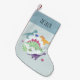 This cute and fun kids holiday Christmas stocking features dinosaur cartoons, with a t-rex, stegosaurus and jurassic jungle plants, and can be personalized with your boys name. The perfect modern dinosaur themed Christmas keepsake for your baby, toddler or child this holiday season!