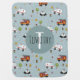 This cute blue custom baby blanket design features an emergency vehicle transport pattern, with a red fire engine truck, police car, and ambulance. There is also space for you to add your boys name and monogram in a beautiful font, on a blue background. The perfect transport-themed addition for your baby nursery, or for your next baby shower.