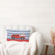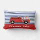 This boy's personalized cushion features a cute fire engine on a red background with and blue and white striped upper half. The image has a white contour line around it to help set it apart from the background. It's ready to be personalized and is suitable for a boy's transport of fire truck theme bedroom or for a boy who like fire engines.