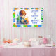 Personalized welcome to our birthday party banner. Cute little boy playing video games. Blue, green and orange paint splatter background.