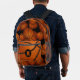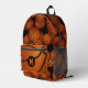 This fun and sporty basketball backpack features a random pattern of varied size basketballs turned every which way on a black background - customize with basketball player's monogram overlying the realistic image of an abstractly oversized basketball on the front pocket - by katz_d_zynes