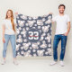 This sporty baseball / softball themed fleece blanket for boys or girls features a randomly arranged pattern of baseballs / softballs in varying sizes turned every which way on a slate blue background - player name in an "autograph" style font and large jersey number in a varsity-letter style font are customizable - by katz_d_zynes