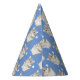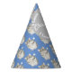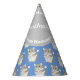 This boys party hat features a Cute Grey and white hamster pattern design, with a fluffy hamster on a blue background. The name can be changed.