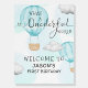 First Birthday Welcome Sign. Boys ONEderful World Welcome First Birthday welcome sign design with blue hot air balloon and fluffy floating clouds. Wanderlust and wonderful world first birthday party for boys.