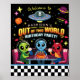 Welcome guests with this fun Out of This World birthday welcome sign featuring cute aliens, a UFO, and a playful retro space diner theme. Neon stars and a classic checkerboard floor add a colorful 1950s galaxy vibe. Personalize with your child’s name and age for a unique space birthday party welcome poster. Perfect as a printable sign for an alien, outer space, or galaxy themed kids party.