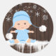 Boys snowflake baby shower stickers with adorable baby boy wearing a cute baby blue snow outfit and hat on a rustic snowflake background. You can add text to personalize these cute winter baby shower stickers.