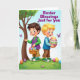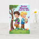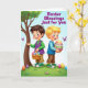 This card shows two young boys standing close together on a bright green lawn beneath a soft blue sky, with a sturdy tree trunk and leafy canopy along the left side. Near the top, a short Easter greeting sits centered in thick, festive lettering, colored in a warm golden tone that stands out against the sky. The boy on the left has dark brown hair and rosy cheeks, holding a woven basket packed with patterned eggs, and his open hand reaches toward his friend as if offering to share. Beside him, a blond boy lifts one oversized decorated egg, covered in stripes and rounded shapes, and the two exchange wide smiles that feel like a sweet moment of friendship. Scattered eggs dot the grass in bright spring colors, adding little points of celebration around their feet 🐰. Soft light washes over the scene, and a couple of small purple butterflies float in the background 🌷. A leafy green canopy spreads above the boys, while the basket’s eggs show tiny dots, zigzags, and bands in mixed colors.