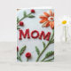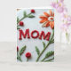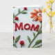 Designed with a cozy, close-up view of embroidered fabric, this card centers on the word “MOM” stitched in deep red thread with a raised, braided texture that feels full of care ❤️. The letters sit prominently in the middle, drawing the eye first, and their thick stitching casts tiny shadows on the white cloth beneath. Curving around the text are green stems and softly textured leaves that lean inward as if gently hugging the word. Small round red accents, like berries, dot the greenery and echo the red lettering in a sweet, affectionate way. In the upper right area, a detailed flower opens with orange and white petals, its stitches layered so the edges look slightly lifted. The lighting is soft and diffused, making the thread’s texture stand out without harsh contrast, like a quiet moment shared between loved ones 🌼. The background remains a smooth, bright white fabric, while the orange-and-white flower sits near the top right corner above the curving green leaves.