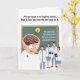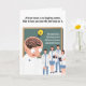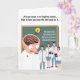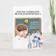 A graphic illustration featuring a cartoon professor with his brain visible in his head having a light bulb idea while brainstorming how to tackle a brain tumor operation on a patient. The neurosurgeons and physicians are standing in a lecture room with a blackboard behind them on which the names of the four most common tumors appear. The words, a brain tumor is no laughing matter. Glad to hear you have the best team on it, appears on the outside and the inside has your own personalized message to convey your heartfelt sympathy and recovery wishes to a friend, loved one or work colleague.