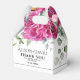 This wedding favor box displays eucalyptus branches with pink rose flowers and sage green leaves. The couple's names are elegantly displayed in decorative typography. A 'Thank You' message is also included, expressing gratitude to the guests. Completing the look, a stylish black thin line adds a touch of sophistication at the bottom of the box.