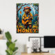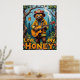 This heartwarming artwork captures a bear dressed in firefighter gear, including a helmet and sunglasses, playing an acoustic guitar while comfortably seated on a thick tree branch in a dense forest. A jar of honey hangs above, suspended from another branch. The background features tall trees and lush undergrowth. The painting's thick, textured strokes add to the endearing quality of the image, with the words "Love My Honey" featured below.