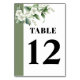 This sophisticated wedding table number card showcases a beautiful combination of greenery and white flowers within a charming white frame. The left side of the card is adorned with a sage green border, adding a touch of elegance. In the upper left corner, a graceful branch embellished with white flowers and lush greenery creates a captivating focal point. The text on the card is presented in a bold and eye-catching typography, further enhancing the overall elegance of this design.
