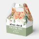 This wedding favor box features a beautiful design of a branch adorned with peach rose flowers and green leaves. The names of the couple are elegantly displayed in bold typography, while a heartfelt 'Thank You' message is also incorporated into the design. To add a touch of sophistication, a sage green band is positioned at the bottom of the box, completing the overall look with a subtle yet stylish detail.