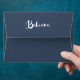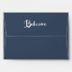Dark blue envelopes with white cursive text that reads Believe on the outside flap, inside has a branches and berries laurel wreath!