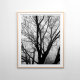 A digital color print of a tree in the fog; photo by becky nimoy; appears black and white but it is taken in color.